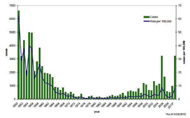 This graph shows the rates of whooping cough (pertussis) in California over the half century. The data show that after the introduction of the pertussis vaccine, the number of cases dropped dramatically, but that in the last decade, the cases are on the rise. Currently, in 2014, epidemiologists consider California to be suffering from a whopping cough epidemic.