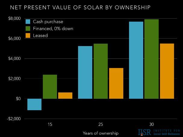 Any car buyer can tell you that ownership tends to be a better deal than leasing. That’s why only 25% percent of new cars were leased in 2013. The same is true for solar: ownership (while involving more risk) means better financial rewards. Whether you pay upfront or finance your investment, it will pay off down the road.
