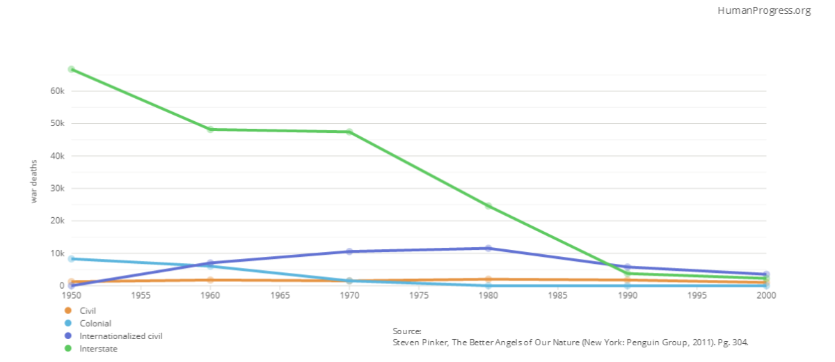 Despite what some foreign policy hawks might claim, the long term trends in data show an increasingly safer world. War has become substantially less deadly as, in the last 50 years, the number of deaths from war has decreased significantly, especially in the case of interstate conflict.