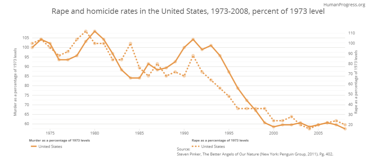 Many Americans hold the false notion that violent crime is on the rise in the US. That perception, though, couldn't be further from the truth. Since 1973, the rates for both homicide and rape in the United States have decreased substantially: falling about forty and eighty percent, respectively.