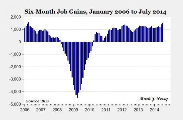 The increase in US payrolls over the last six months through July (1,465,000) was the strongest six months for hiring in the US since April 2006. More than 200,000 new jobs were added in each of the last six months — the last time that happened was 1997!