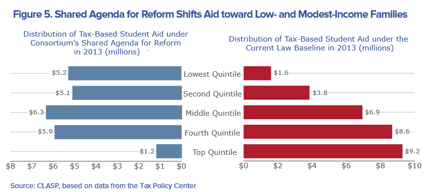 Under proposals, tax-based student aid would go to the low- and modest-income families and individuals who most struggle with college costs. Proposed reforms should shift tax-based aid toward families in the bottom 80% of the income distribution. Target tax breaks to institutions that meet at least a minimum responsibility threshold for enrolling low-income students and helping students persist and complete.